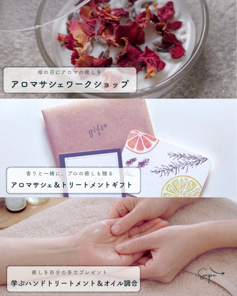 お母様への贈り物として、アロマサシェワークショップに加えて、プロのトリートメントをプレゼントできるコースです。